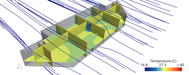 SSEL performed HVAC optimization for the wheelhouse of an SMR-powered container ship using Simcenter STAR-CCM+ and Simcenter AMESIM. The research aimed to assess the impact of hull design and HVAC operation on cabin temperature and comfort, applying a multidisciplinary approach integrating 1D thermal system modeling and 3D CFD analysis.