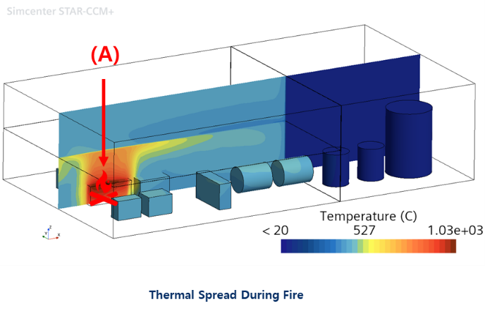 As part of the fire risk analysis, a scenario was defined where a fire originates from a converter in the generator compartment. Because initial fire detection and suppression were deemed to fail, the fire growth was classified as ultra-fast and students performed thermal simulations using the CFD solver of STAR-CCM+.