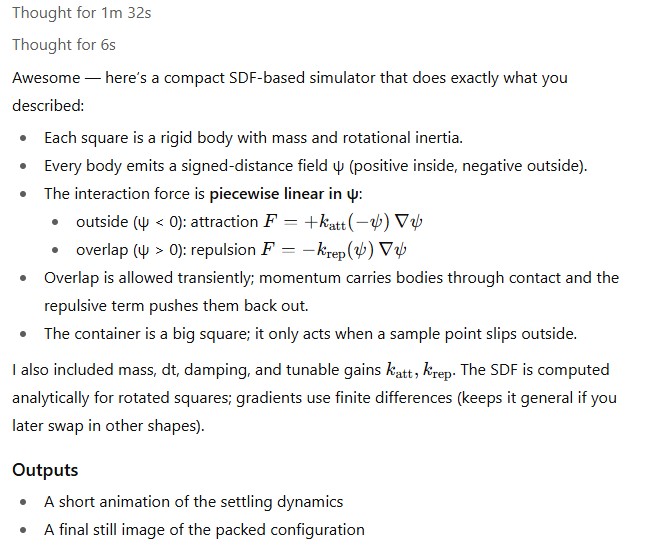 “I think the use of SDFs would be the way to go. +ve values (i.e. outside) attract, -ve values (i.e. inside) repel. Each shape should have a mass and inertia should be accommodated. The only ‘knobs’ to vary would be the mass of each shape, the dt time step considered then, most importantly, the force field strength as a function of the SDF value (maybe a linear piecewise definition would be good). I’ll leave it to you to propose the initial Force=f(SDF)! Can you generate the Python for me and some form of visual output?“