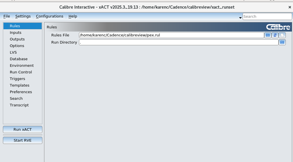 The first page in Calibre Interactive is Rules. This is where you add your top-level SVRF rule file that includes your LVS and xACT rules from the foundry.