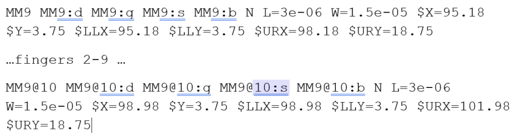 The parasitics between each of these 10 fingers, for example, in the polysilicon, will be captured in the parasitic netlist.