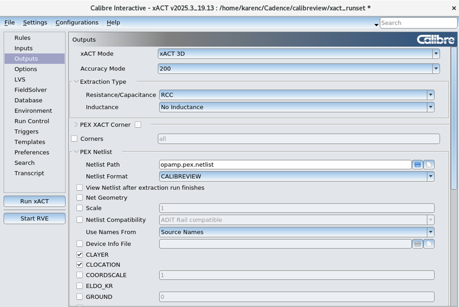 The Outputs page is where you specify the output format of the extracted netlist. For the xACT Mode, you can specify xACT for faster parasitic extraction, or xACT 3D if you want high accuracy 3D field solver accuracy. In the PEX Netlist section, you can specify which netlist format you want, for example, DSPF, Hspice, or the Cadence CALIBREVIEW extracted view format, which is what we use in this example.