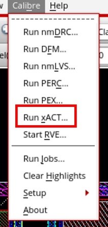 To run Calibre xACT for this sample design, select the Run xACT option in the Calibre menu: