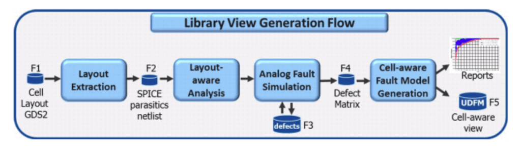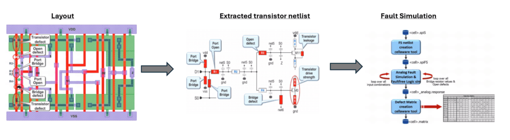 The effectiveness of Tessent CellModelGen comes from its methodical, four-step characterization flow—layout extraction, defect analysis, analog fault simulation, and finally cell synthesis. Initially, it extracts detailed transistor-level netlists along with associated parasitic elements. These extracted data sets form the basis for comprehensive defect analytics, precisely calculating critical defect probabilities and areas. Subsequently, CellModelGen runs targeted analog fault simulations to rigorously evaluate and capture every possible defect detection scenario within the library cells, enabling an optimized and accurate cell-aware library generation.