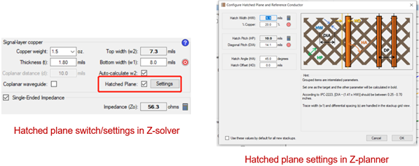 To enhance the Z-solver functionality, a hatch plane option was added to support rigid/flex designs. Hatched planes are commonly used for rigid/flex plane layers. When set, the impedance will use these hatched planes for all calculations.