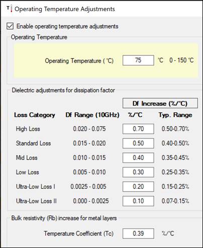 Z-Planner Enterprise 2510 introduces operating temperature adjustments, a feature that when toggled on, accounts for the changes within Df associated with temperature rise. Recommended values are set based on a material’s loss category and scale with the change in operating temperature. Operating temperature adjustments also account for the bulk resistivity (Rb) of copper layers, decreasing the conductivity relative to the temperature.