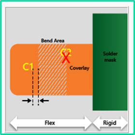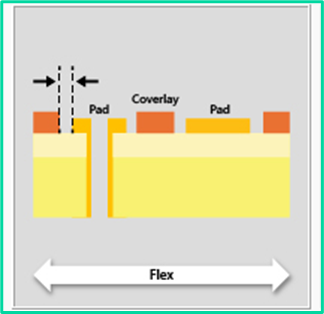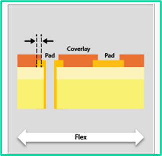 In rigid-flex and flex designs, it is essential to maintain consistent material beneath a component in the flexible section. To ensure this, the component’s copper pads must be positioned at a sufficient distance from the coverlay’s outer edge on the opposite side.