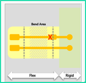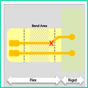 In rigid-flex and fex designs, copper traces inside the flexible portion are subjected to compression and tension. A change in the copper trace width close to the bend area can create stress points susceptible to cracking and failure during bending. Consistent trace width helps distribute mechanical stress evenly. Changes in trace width inside the bend area are reported to the constraint Flex – line changes width in bend area.