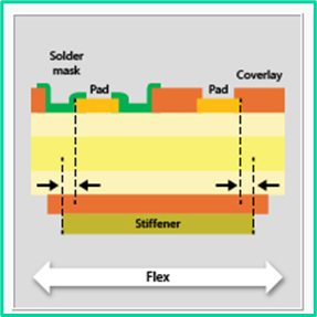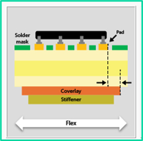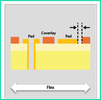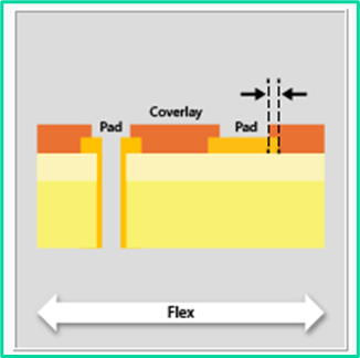 Like the requirement for the placement of a stiffener, the edge of the copper pad must remain a required distance from the inner edge of the coverlay placed on the opposite side of the design. In this case the manufacturing outcoming to avoid are the pealing or delamination of the coverlay, or the cracking of the adhesive under the coverlay resulting from the position of the more rigid copper relative to the coverlay edge which asserts additional stress during flexing or thermal cycling.