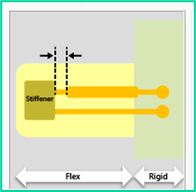 To ensure that the component or connection is mechanically supported, there must be an adequate distance from the edge of the copper pad to the inner edge of the stiffener material on the opposite side of the design. The distance is largely required because the stiffener is manually placed, and the accuracy is always in question. To ensure a stable copper surface is present, the copper edge when measured from the opposite side must be a suitable distance from the inner edge of the stiffener.