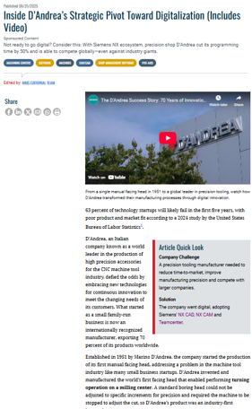 In precision manufacturing, competitive advantage often comes down to speed, accuracy, and the ability to adapt. For Italian tooling manufacturer D’Andrea, meeting these demands meant rethinking how products are designed, programmed, and manufactured. Modern Machine Shop, premier publication dedicated to CNC machining and metalworking technology, recently featured the success of D’Andrea’s transition to a fully integrated digital approach powered by Siemens’ NX CAD, NX CAM, and Teamcenter. This shift has enabled the company to reduce programming time by 50%, shorten delivery cycles, and strengthen its global position in the high‑precision tooling market.