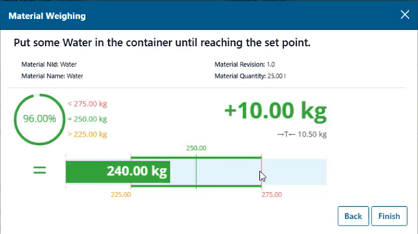 • Weighing control integrated in the Material Preparation ​and Consumption Task (scale connectivity via OPC UA interface)