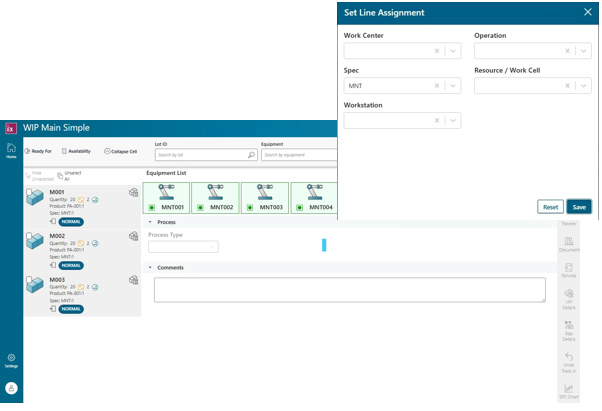 - Setting the Line Assignment from the Settings icon in Menu bar populates the WIP Main Simple Lot and Equipment lists for the configured Line Assignment.