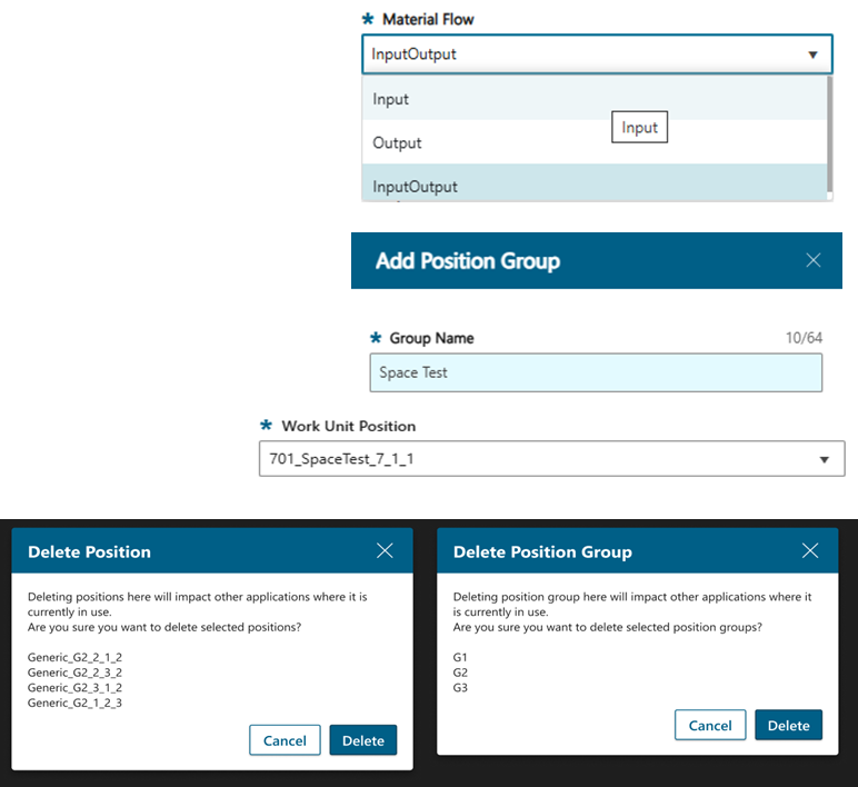 - Mandatory Material Flow field when adding a position group, as Transport Management requires this for correct material routing