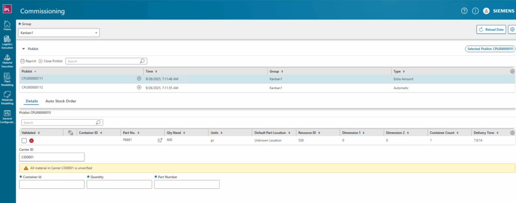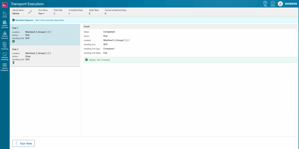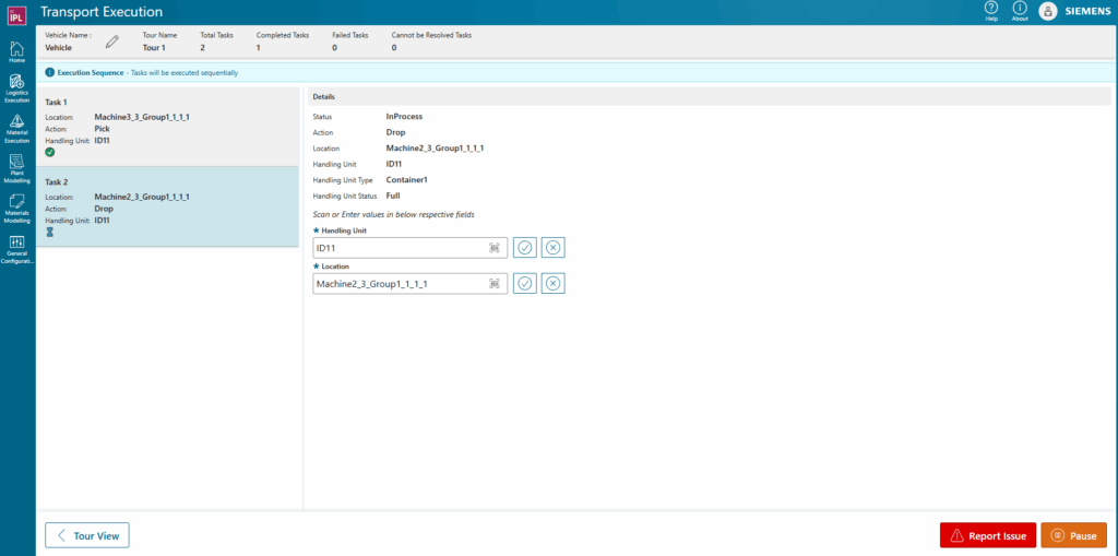The new Transport Execution App in the IPL Portal provides a simplified execution interface designed for tablets or vehicle‑mounted PCs. Operators can view assigned or expected tours per vehicle, execute tasks (e.g., pickup and delivery) using scan‑enabled workflows, and report task status changes.