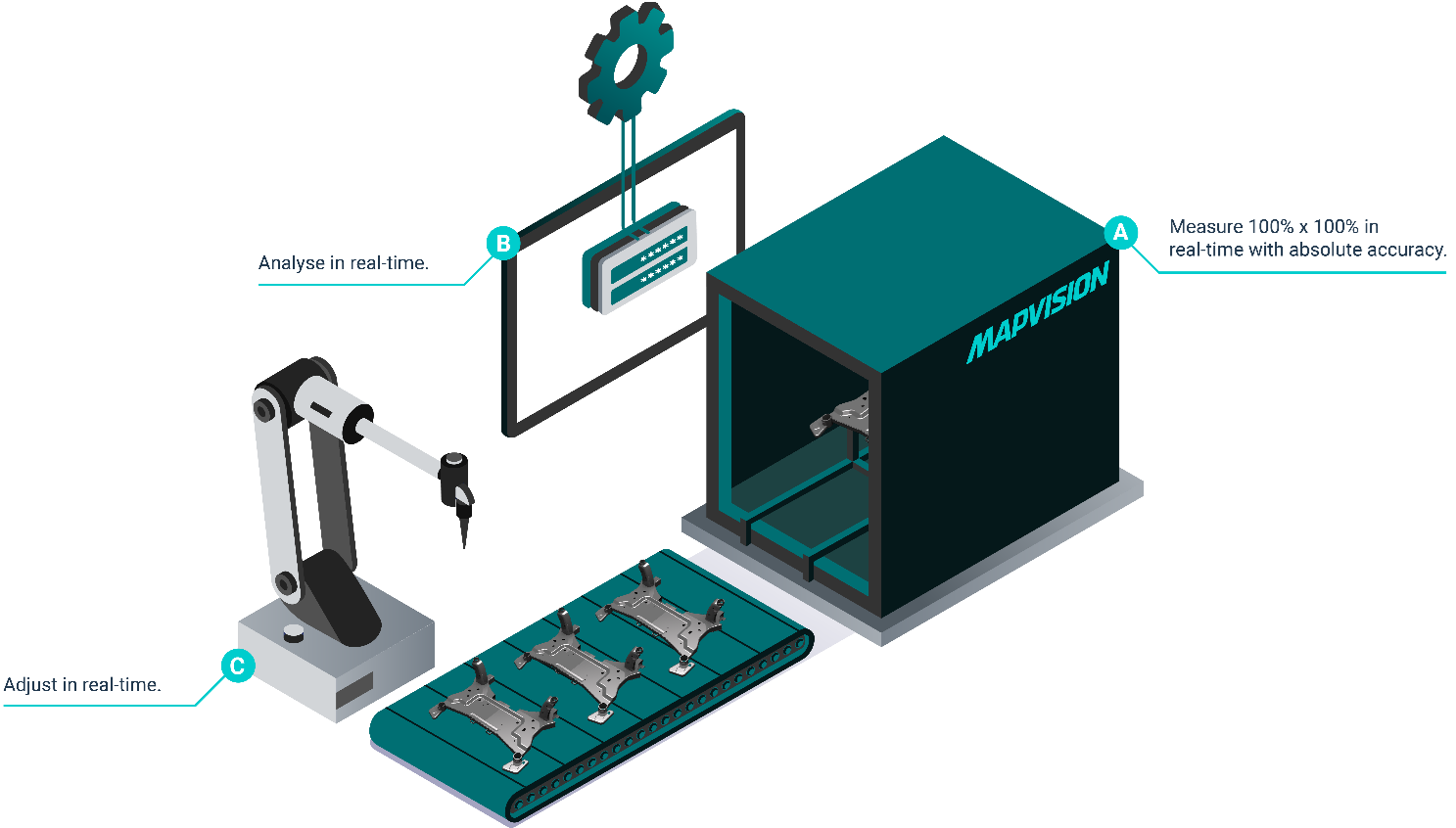 Mapvision inline measurement systems are based on a patented multi-camera technology which measures part dimensions from images. Traditionally, real parts measured with slow and tactile CMM-machines have been used as reference.