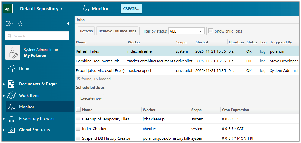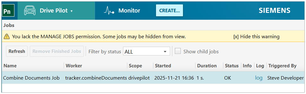 In contrast, users granted the MANAGE_JOBS permission have full visibility into all executed jobs and the ability to execute system jobs directly from the