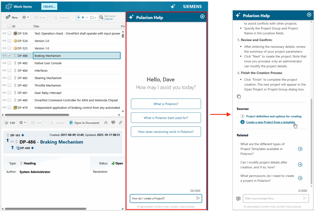 And finally, to conclude on the productivity boosters, we’re introducing the Polarion Help AI Chatbot. This intelligent, AI-powered documentation assistant is designed to be a readily accessible resource, available directly from anywhere within Polarion. You can ask your questions, and it will provide clear, digestible help, serving as a quick reference without needing to search through extensive documentation, basically acting as your own support agent.