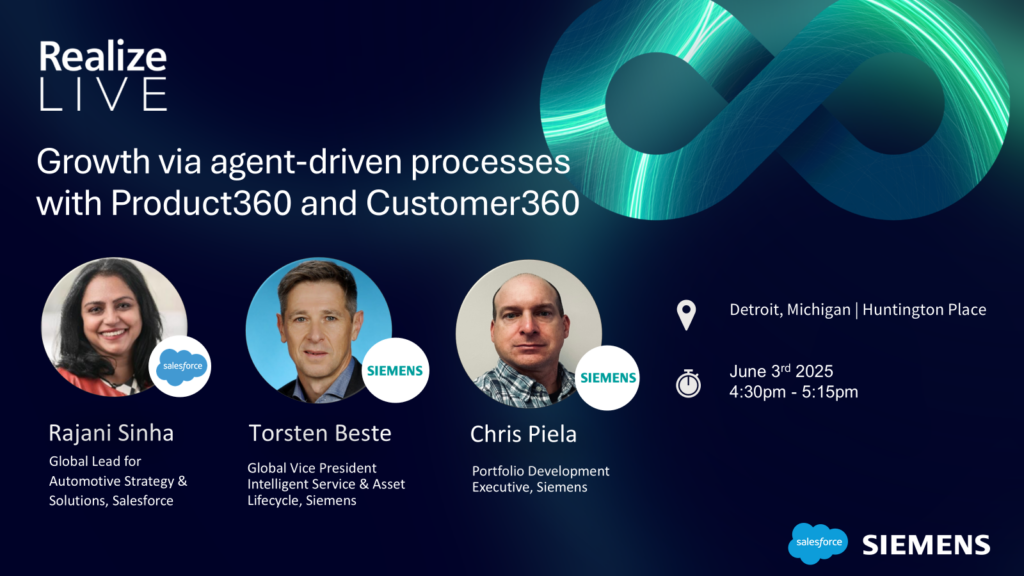 In this session, Salesforce and Siemens will explore the value of connecting PLM and CRM, specifically through Teamcenter Service Lifecycle Management (SLM), to improve revenue via asset monetization. Attendees will see how a comprehensive digital twin focused on the customer experience can drive business growth by integrating Customer 360 and Product 360. Attendees will learn how Siemens and Salesforce customers are using Teamcenter SLM to boost profitability and achieve sustainability goals. Industry leaders will share best practices and demonstrate how AI and innovative solutions can transform business operations for service excellence.