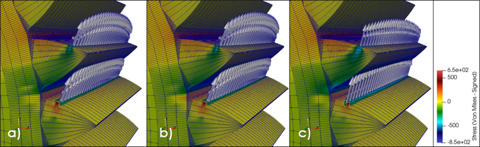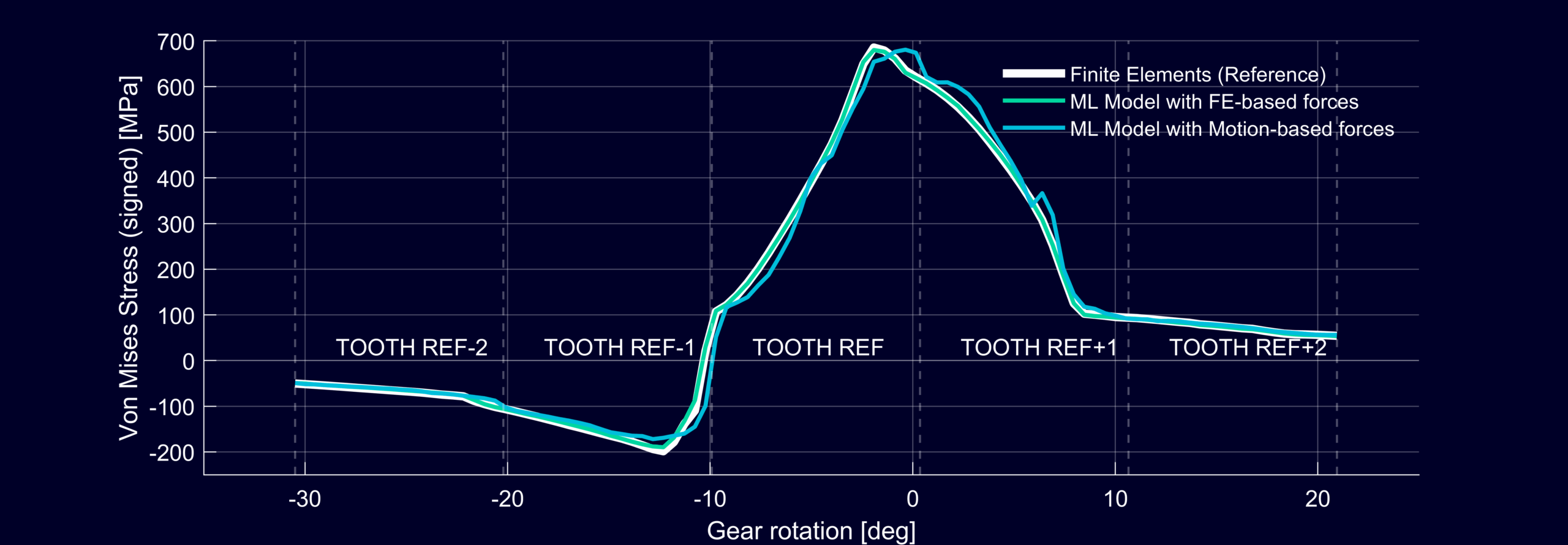 Figure 2 presents an analysis of the full stress field using the three approaches. The stress field predicted by the AI/ML surrogate model with FE-based contact forces as input (Fig. 2b), shows to be near-identical to that of the reference FE-based results (Fig. 2a), while the stress field predicted by the AI/ML surrogate model with Motion-based contact forces as input (Fig. 2c) shows only minor deviations from the reference results. These findings are confirmed by Figure 3, which presents the results for the tooth root stress during five mesh cycles for a point located along the middle of the face width and in the middle of the tooth root arc.