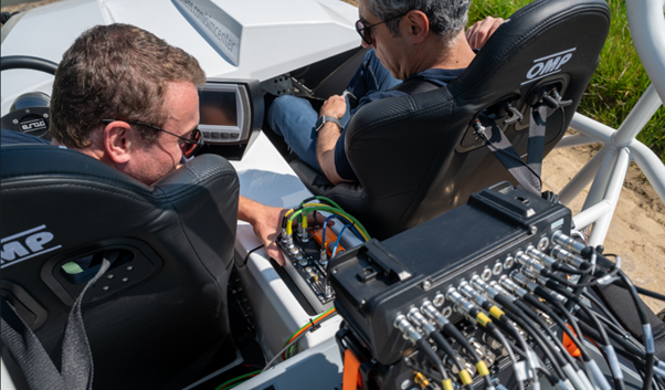 Safe high-voltage zone measurements in action: Engineers conduct tests with Simcenter SCADAS RS and CSM measurement systems on public roads and in a protected testing environment.