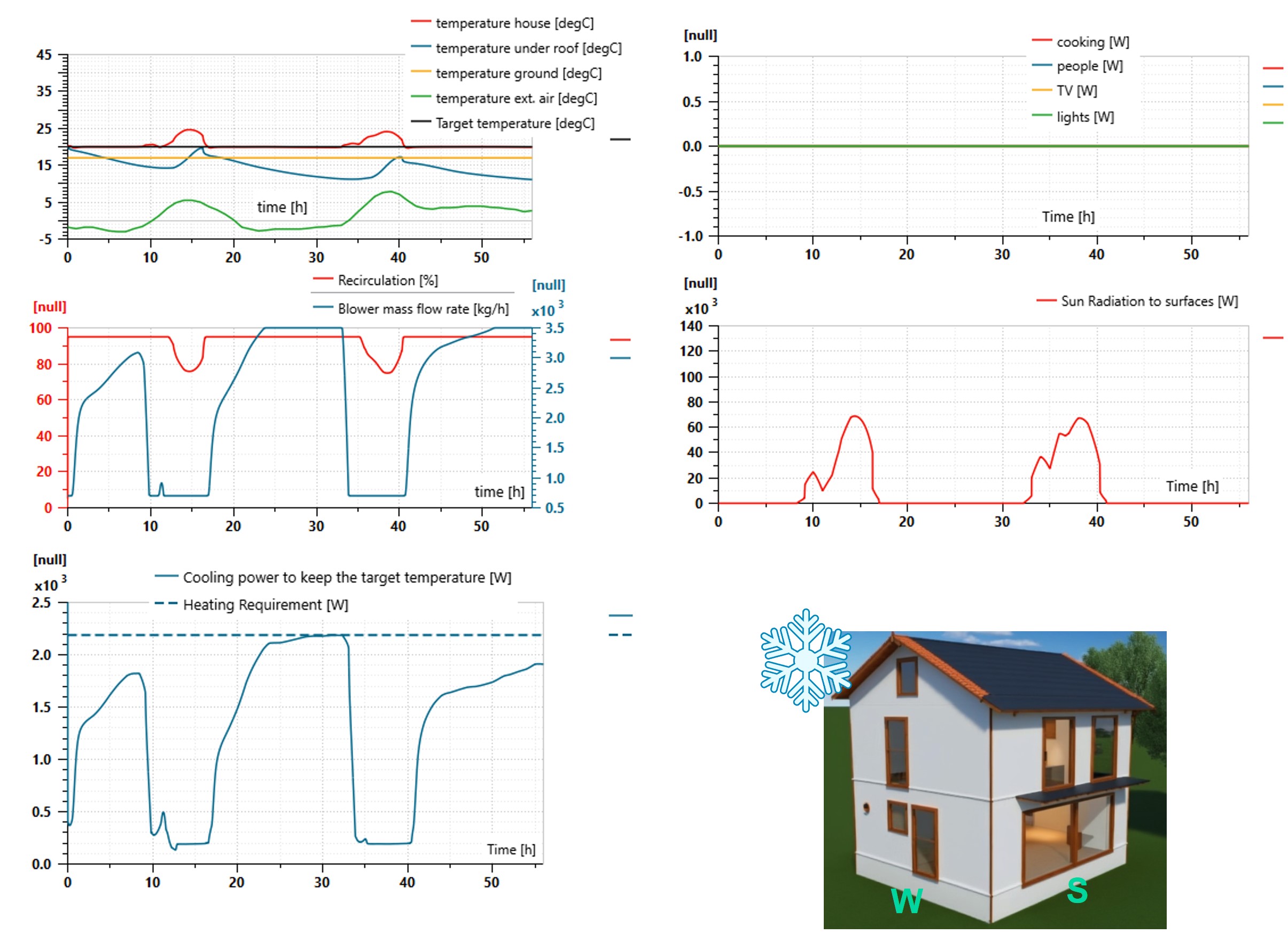 - Fans: a PID controller is regulating the air velocity based on the actual and target house temperatures