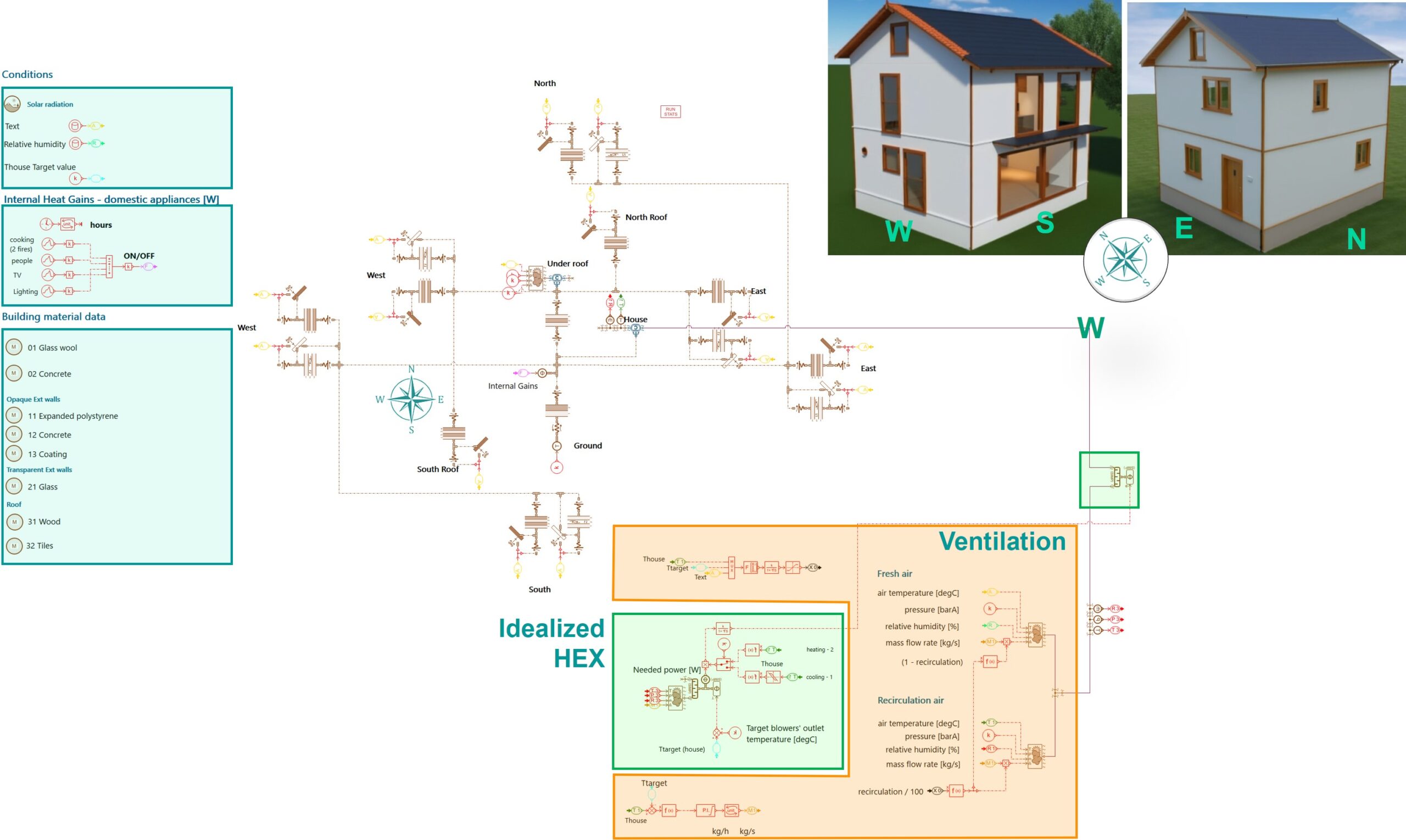 The Simcenter Amesim transient thermal model of the residential house in Figure 1 includes: