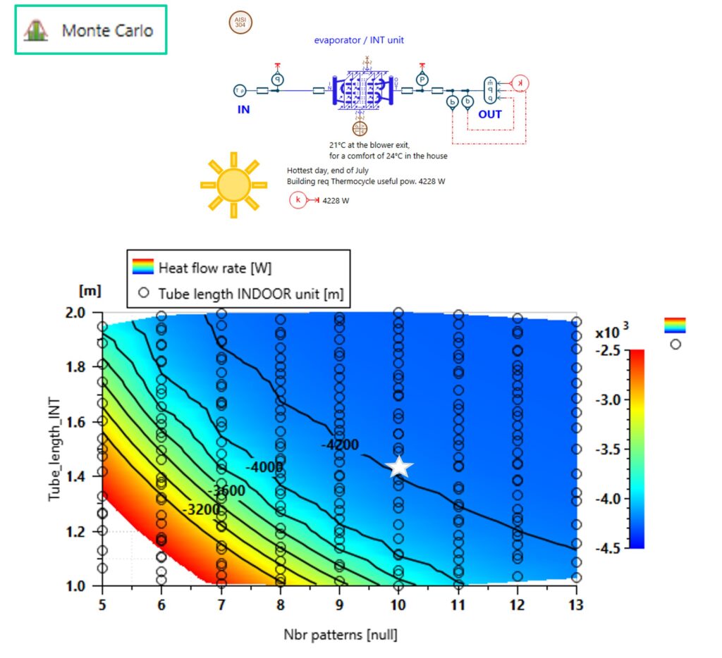 For the heat exchangers’ sizing, boundary conditions as from the thermodynamic cycle APP with R290 refrigerant as well as extreme external temperatures are applied to the component. A design space is explored using an Optimized Latin Hypercube sampling in a Monte Carlo study, whose simulation results are depicted in Figure 6. For the internal unit operating in cooling mode, it is found that 10 repeating patterns and a tube length of 1.45 m are suitable to meet the required evaporating power.