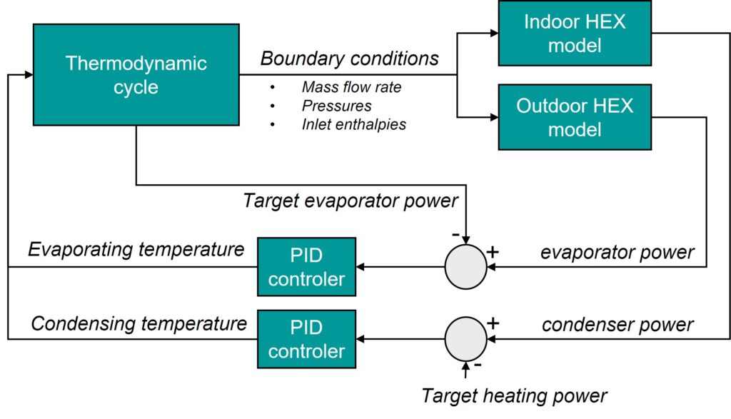 The closed loop system model is obtained by replacing the reference suction boundary conditions with the accumulator and imposing to the system the refrigerant charge previously calculated (the highest value between cooling and heating mode). Moreover, a PID controller for the EEV valve is introduced to ensure that the evaporator outlet conditions and a 4-way reversing flow valve is added to switch the heat pump’s operating mode.
