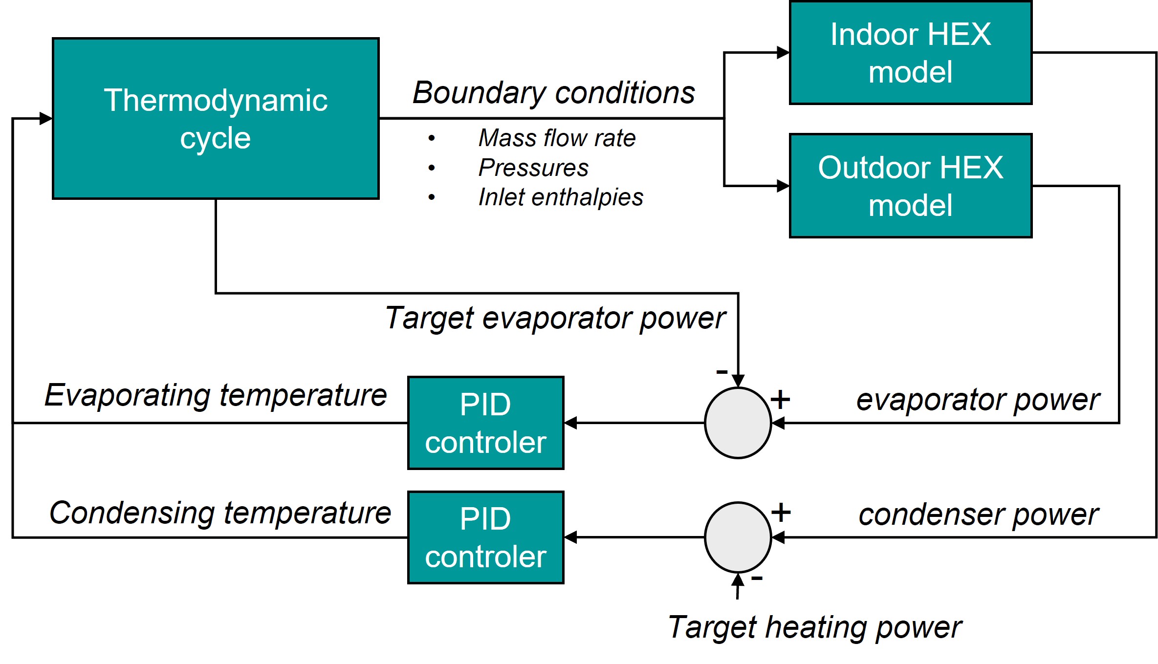 - Electronic expansion valve (EEV): a PID controller is regulating the valve opening to keep the target evaporator outlet enthalpy