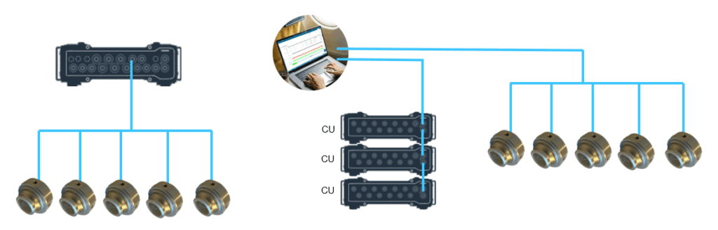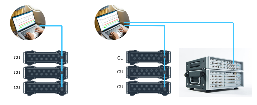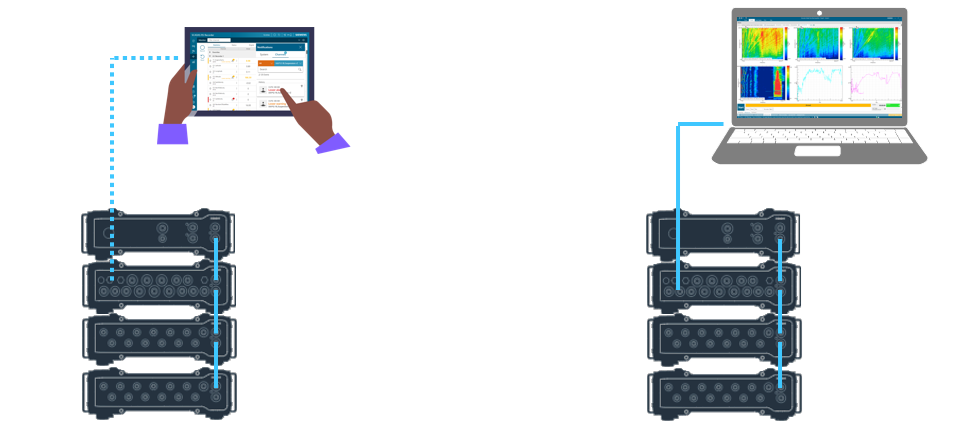 (Right) Frontend mode – with wired connection and data transfer to Simcenter Testlab