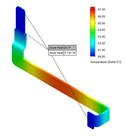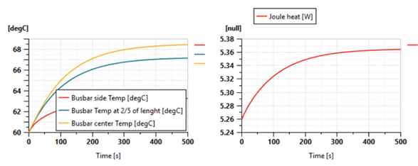 The DC bus bar cross section is determined at the max current operating condition with the objective to remain as light as possible and with a temperature increase lower than 10°C. After several iterations we select a Copper material with a 23x3mm section: the thermal response satisfies the design rules.
