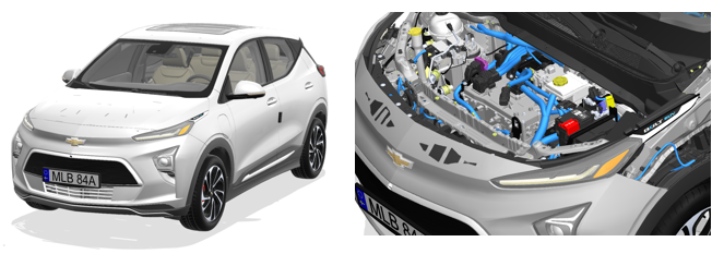 The design space defining the volume we can use for the traction inverter design is taken from a comprehensive Chevy Bolt CAD model dataset. A full vehicle model is created to provide boundary conditions to the traction inverter and component models created during the workflows. We also consider the DC link and the bus bar.