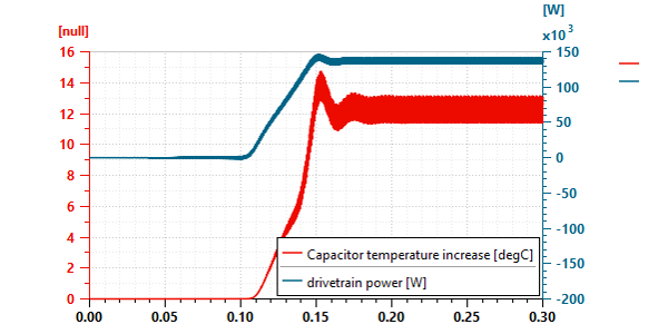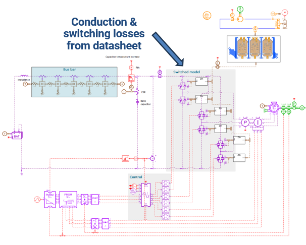 As we take advantage of these geometric parameter and functional system models we can already predict bus bar ohmic heating, DC link capacitor heat losses, conduction and switching losses in the SiC Mosfet and therefore the temperature evolutions of the major components of the assembly. We can arbitrate the effect of the cooling architecture layout on the temperature distribution between these components which is known to impact their performance and reliability.