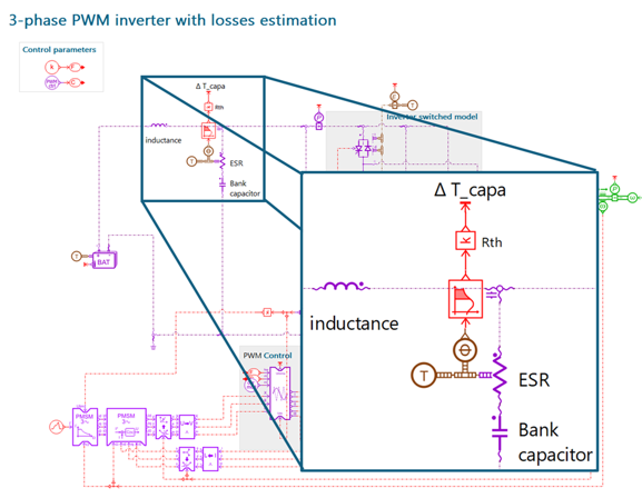 The level of fidelity of the traction inverter system model increases as the project transitions from pre-sizing to pre-design stage, where the DC link, bus bar and SiC Mosfet pre-sizing models are combined.