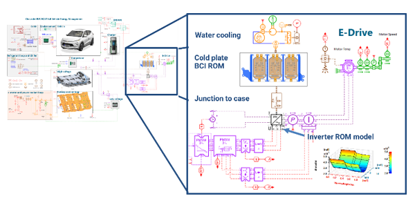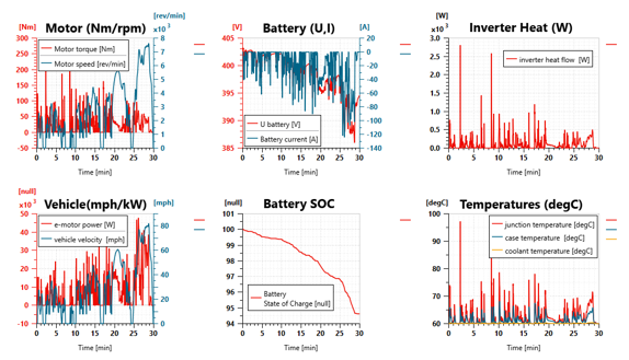Let’s go to the final step for the integrated performance. The reduced quasi static model of the drivetrain and BCI-ROM of the combined power modules and cooling plate are integrated into a full vehicle energy management system simulation model. This model enables fast simulations compliant with typical vehicle long driving cycle scenarios and the evaluation of the vehicle performance, efficiency and thermal reliability based on diverse and realistic load cases.