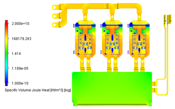 Within the formulation of this 3D simulation, the resulting system temperature levels are a combined effect of electronic component power dissipation, Joule heating and boundary conditions including the coolant temperature and flow rate, and the ambient conditions. Evaluating these temperature levels in various steady-state and transient load conditions serves to validate that all components remain within their specification for the operating conditions.