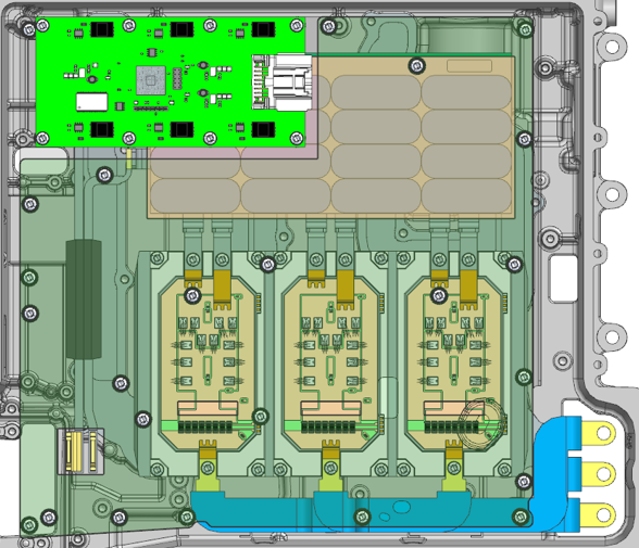 The 3 power modules of this 3-phases traction inverter are packaged together with a cooling plate connected to the cooling circuit. The circuitry of the PI4000 power module and INV100 Gate Driver are designed with the Siemens EDA solutions.