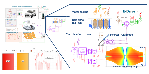 Let’s go to the final step for the integrated performance. The reduced quasi static model of the drivetrain and BCI-ROM of the combined power modules and cooling plate are integrated into a full vehicle energy management system simulation model. This model enables fast simulations compliant with typical vehicle long driving cycle scenarios and the evaluation of the vehicle performance, efficiency and thermal reliability based on diverse and realistic load cases.