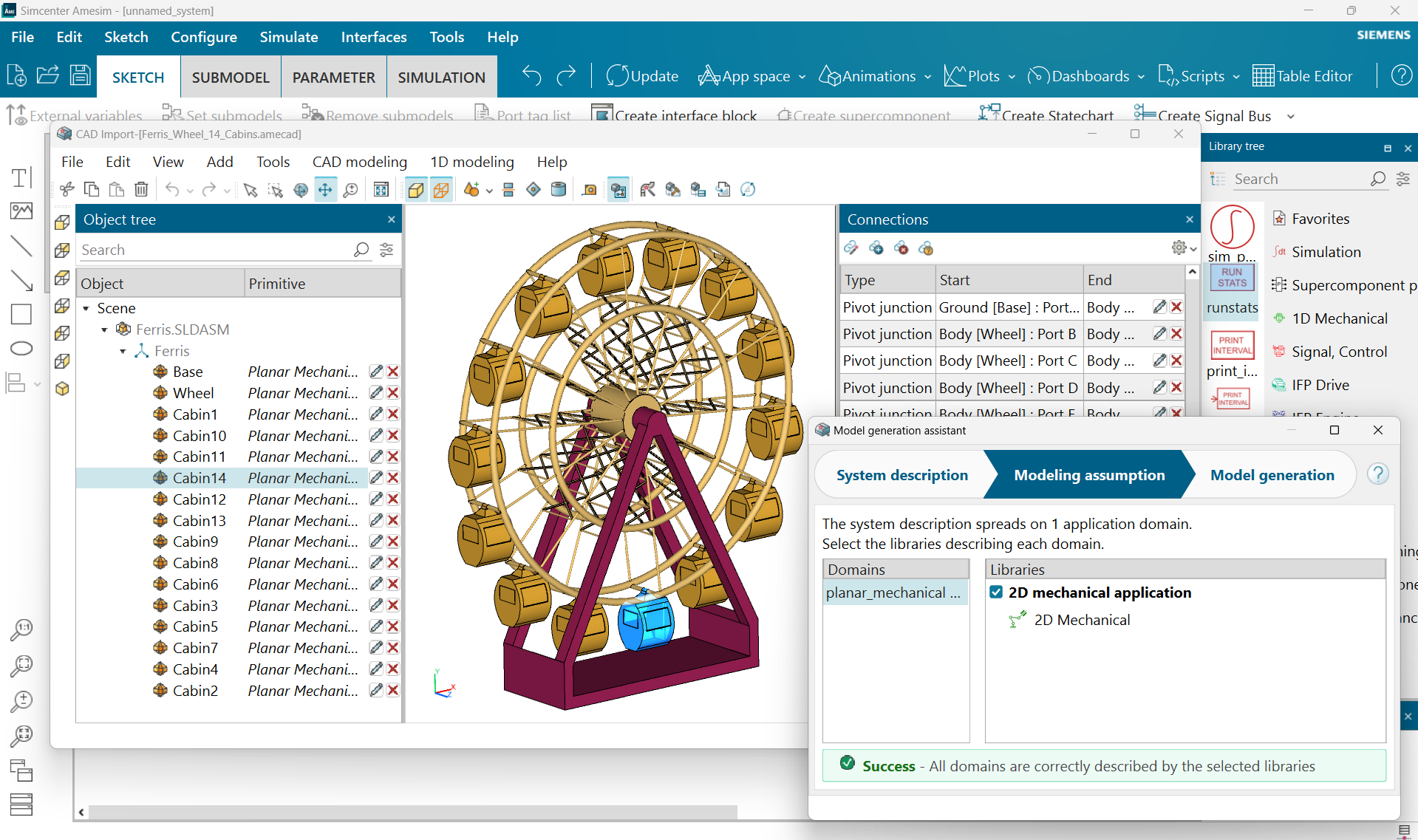 Once I had the simple concept clear, we utilized a CAD model as the basis of the modeling process in our final system. I used the CAD Import feature available in Simcenter Amesim to automatically generate a planar mechanical representation of the Ferris wheel, calculating realistic dimensions, masses, and inertias.