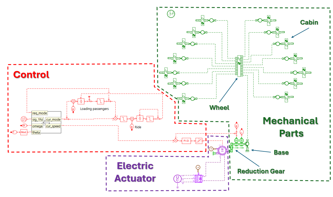 Through experimentation with various loading strategies, we successfully replicated the operational pattern of the original Ferris wheel. The sequence involves the first half of the cabins slowing down for passenger embarkation and disembarkation, followed by acceleration for the ride. Subsequently, the remaining cabins slow down to complete the other half of the ride, optimizing passenger wait times and enhancing the overall experience. Additionally, we conducted Design of Experiment analysis to determine the ideal rotational speed of the Ferris wheel, accurately reproducing the behavior observed in real-world scenarios.