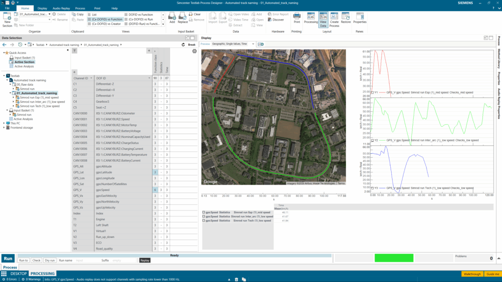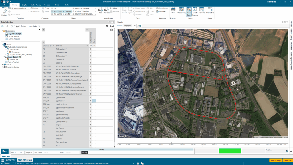 One of the standout features of Simcenter Testlab is its ability to automatically segment long measurement runs into meaningful portions using GPS coordinates. Your measured analog and digital data often includes precise GPS information. Simcenter Testlab intelligently uses this data to identify and cut your recordings based on predefined track sections or geographical areas.