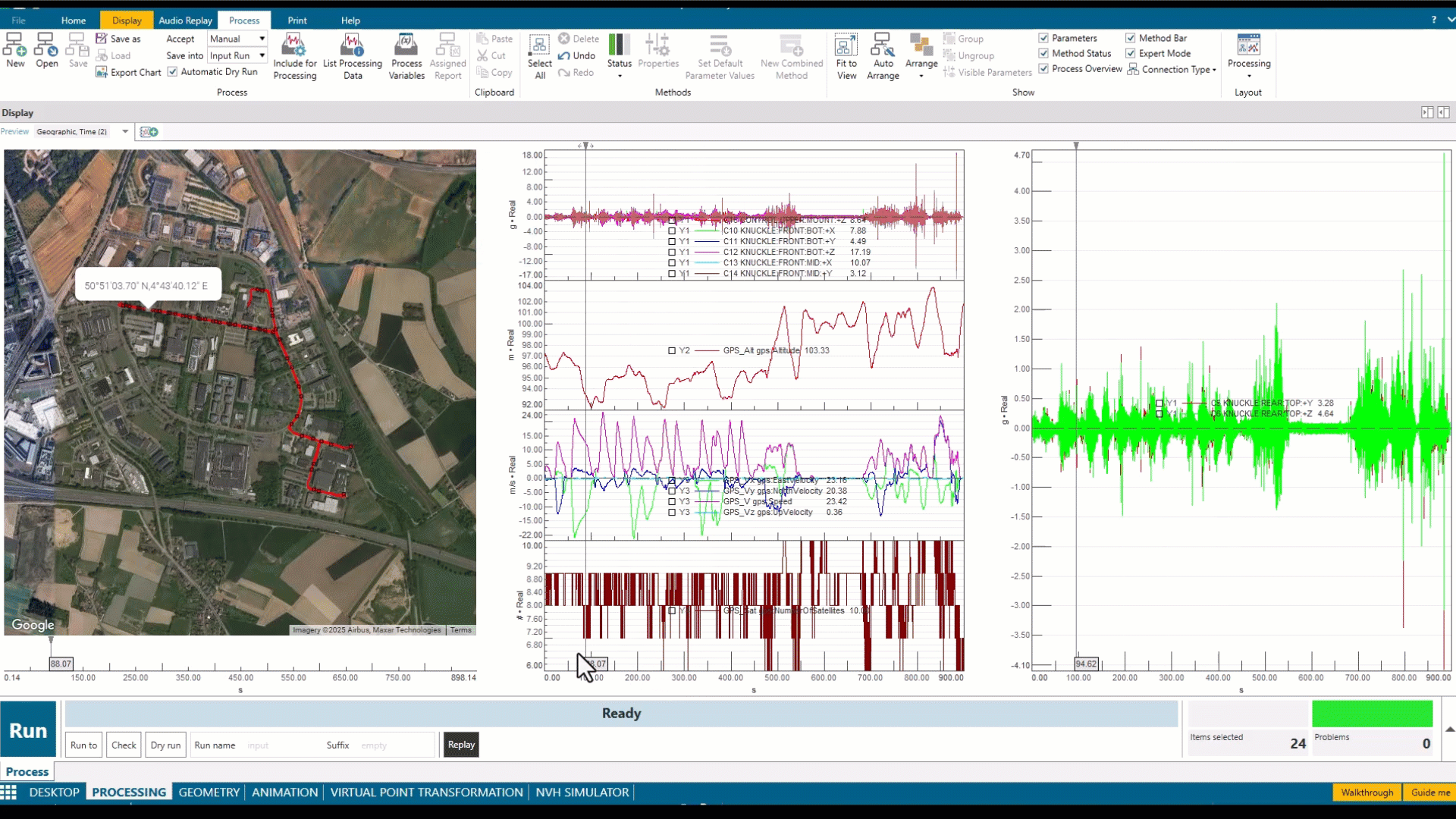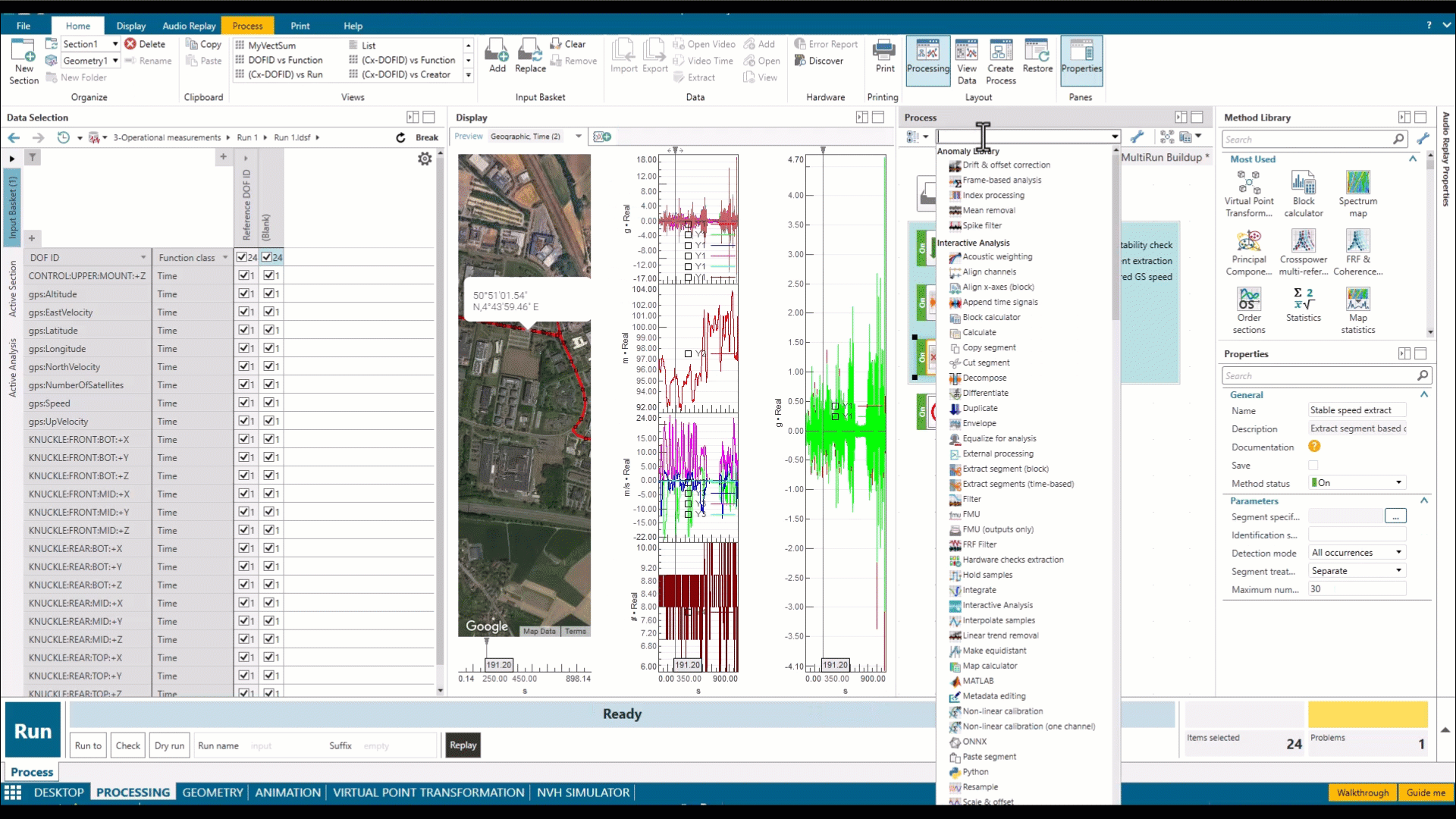 Simcenter Testlab Neo introduces a fully automated way to validate and prepare your data for road noise analysis. The Process Designer capability in Simcenter Testlab Neo can automatically identify the different specific test track segments from one single long trace time. It can identify either smooth or rough road (Belgian blocks), speed (e.g. 30, 50 or 80 km/h), and identify a predefined test track area via GPS position. You can even define your own trigger condition. What this means to you is that you no longer need to manually start and stop your data acquisition at each point on the track, which can ultimately save you time.