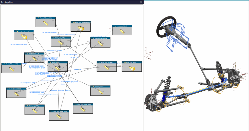 Large complex models can hid mistakes or missing features out of view. With the new Graphical topology map you can now simplify the visulisation of your system to easily see the connectivity of motion bodies and the types of conections (joints/Forces/Constraints).