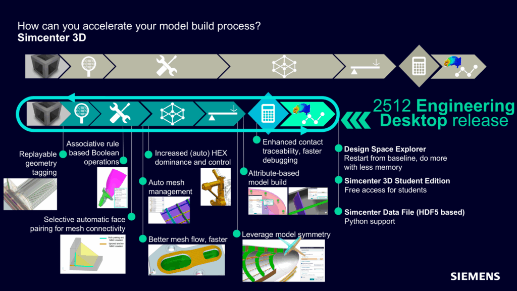 Simulation efficiency can be improved by removing data silos, long setup times, skill gaps, and disconnection from design workflows. With the Simcenter 3D Engineering Desktop 2512 release, we continue our mission to deliver a “Shift Left” that frontloads and maximizes CAD-CAE throughput for innovation and exploration.