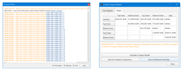 When running the scenarios to create the compact thermal models all messages are reported. For DELPHI models, where there are 44 or 88 scenarios, this results in a lot of information. There are key messages related to the compact thermal model (CTM) generation that you want to see easily, for example – regarding the conversion of temperature dependent conductivity to a constant. In Simcenter Flotherm 2510, these important messages are now viewable in a separate new pane in the compact model dialog.