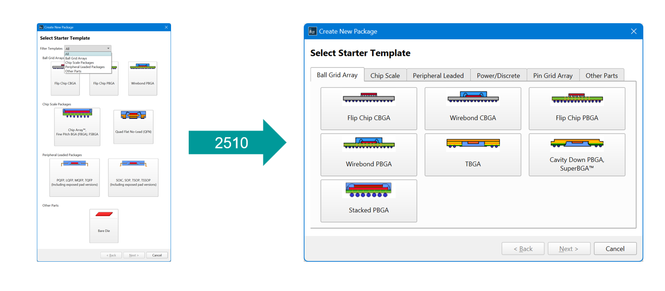 a) New Package Window uses tabs to differentiate template types and make selections clearer.