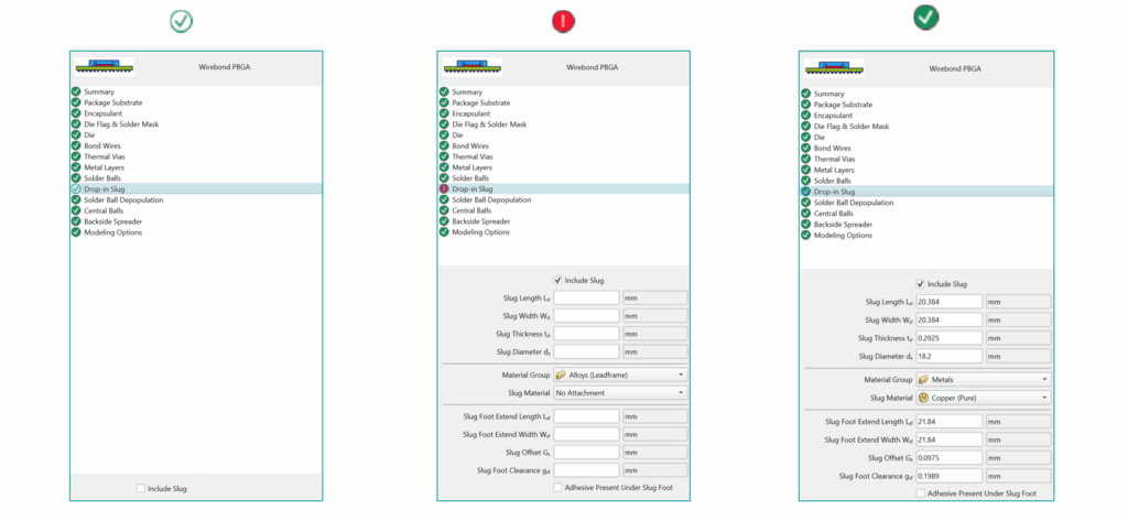 C) The template selection window facilitates rapid check of your package customization. Solid green ticks (checks) indicate required complete definitions, red warnings icons indicate missing definitions, and hollow tick icons indicates where no data is required.