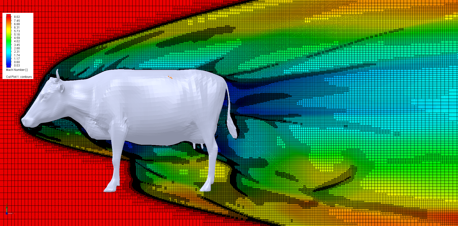 If air flows fast enough over something it can tend to lift itself up. Ask any child running with a kite, trying to get it airborne. If air flows fast over something it can tend to squash it downwards. Ask any F1 racing driver powering around a corner at 120 mph. Our cow has a +ve lift coefficient and at ~1000 mph will lift off. Although there is some supersonic shock formation at such speeds, the hypersonic shock patterns at higher speeds are too beautiful to ignore. So, taking this blog from the sublime to the ridicowlous, let’s study a Mach 8 cow.