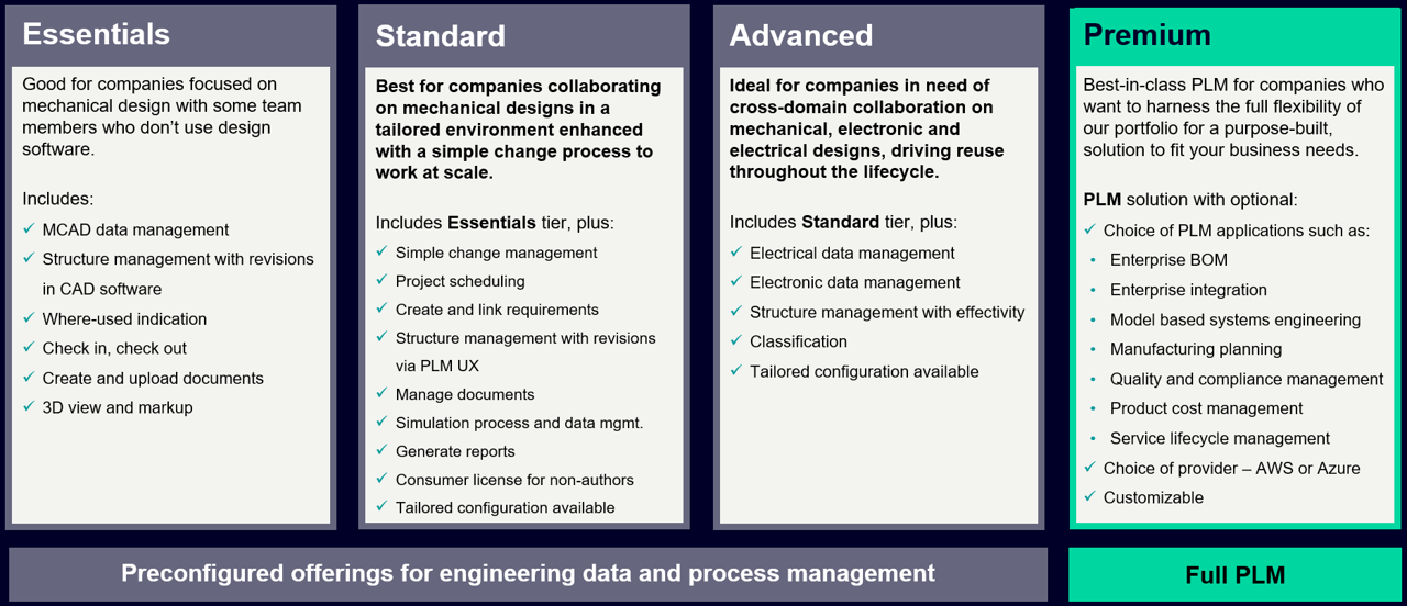 Built with decades of cross-industry knowledge, best practices, operational expertise, and technical know-how, these two new preconfigured tiers target some of the most common engineering data and process management challenges our customers face when connecting people and processes across the enterprise. While preconfigured, they also allow for tailored configurations to ensure unique challenges and needs are met.